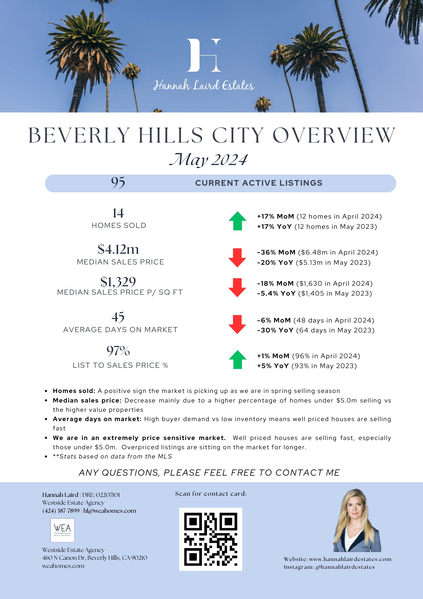 - Median sales price: Decrease mainly due to a higher percentage of homes under $5.0m selling vs the higher value properties